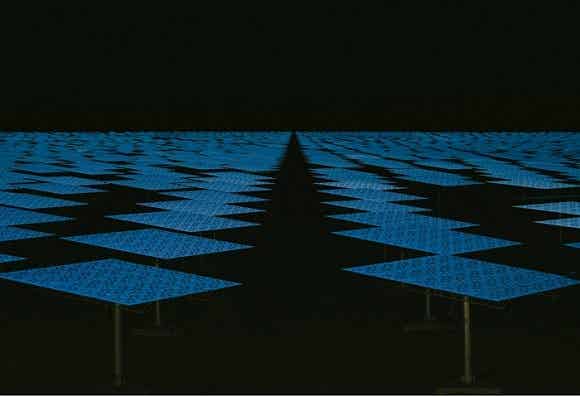 幾年前,euben Wu在從芝加哥飛往舊金山的飛機(jī)上第一次看到了這個(gè)巨大的光熱發(fā)電廠。“我被它發(fā)出的光亮所震懾了,”他說到,“它就像是一個(gè)假太陽。”他也終于在今年三月親自參觀了新月沙丘。他在那從日出待到了日落,終于看到了光線最好時(shí),鏡子會(huì)時(shí)刻保持追蹤太陽的狀態(tài)從而獲得最大的太陽輻射。它們在旋轉(zhuǎn)時(shí)幾乎是沒有聲音的,只能聽到風(fēng)穿梭在鏡子構(gòu)架之間的聲音。“這聲音聽起來讓人難以忘懷。”Wu說到。Wu用Phase One100XF相機(jī)(首款過億像素的相機(jī))拍攝了發(fā)電廠的靜態(tài)圖片,同時(shí)用佳能5D相機(jī)做成了一個(gè)定日鏡,跟隨太陽移動(dòng)拍出了延時(shí)攝影視頻,視頻里采用了由 Zak Marcom作曲的背景音樂。Wu甚至開車去到了鏡子的下面。“我就像是身處在金屬玻璃叢林一樣。”雖然俯瞰能看到一片由金屬構(gòu)成的“森林”,但要想真正感受到它的奇妙,還是得身處其中。