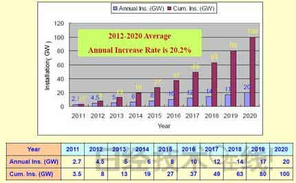 2012年前三季度,太陽能電池組件出貨量約18GW,預計全年將達23GW,但產值同比將大幅下降。2012年預計新增裝機量4~5GW,同比增長66%以上。