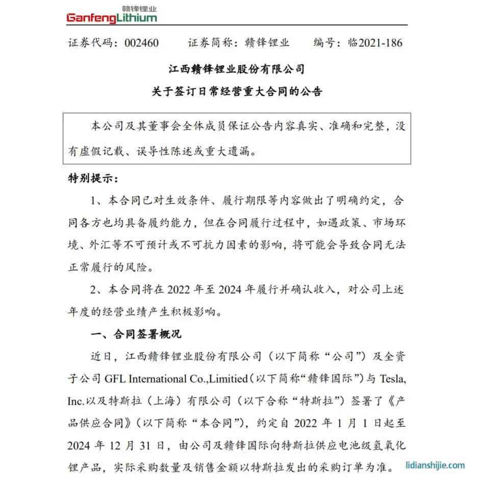 如果這個事實成立,那么小編預計,明年開始,特斯拉的售價會進一步走低,因為近日特斯拉攜手國內贛鋒鋰業,從2022年1月1日起至2024年12月31日,贛鋒鋰業及贛鋒國際將向特斯拉供應電池級氫氧化鋰產品,也就是說從明年開始,國內生產的特斯拉車型的電池將會是“中國造”。