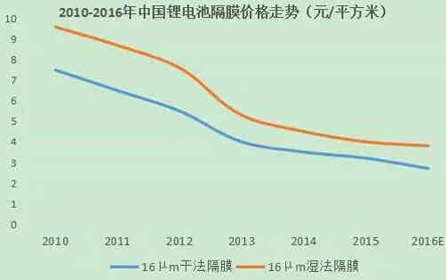 就具體價格來看,在新增產能的沖擊下,國產隔膜價格出現了快速下滑,近五年,國產16μm濕法隔膜市場均價為從2010年的9.5元/平米下降到2015年為4元/平米;16μm干法隔膜均價從2010年的7.5元/平米下降到2015年的3.5元/平米,跌幅均超過了50%。隔膜價格大幅下滑主要是由于國內中低端產能迅速擴張,隔膜企業采用低價競爭戰略占據市場;此外,下游電芯行業也存在中低端產能過剩和無序競爭問題,為低端低價格隔膜產品提供了生存土壤。就細分市場來看,細分來看,2015年,中國干法隔膜出貨4.29億平米,同比增長46.4%;濕法隔膜出貨2.69億平米,同比增長56.4%。2015年以比亞迪為代表的動力電池企業開始轉向濕法隔膜,使得濕法隔膜快速增長,增速大于干法。此外,之前涂覆隔膜主要用于高端數碼電芯和特殊要求的動力電池,2015年由于三元動力鋰電池占比上升,濕法涂覆隔膜需求激增。