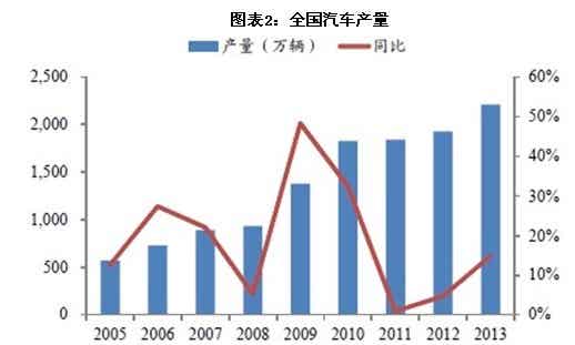 我國已成為全球最大的汽車銷售市場,2013年我國汽車民用汽車保有量達到近1.3億量,增長超過15%,汽車產銷量達到2198萬輛,同比增長6.6%,按照12V80Ah的規格計算,2013年汽車啟動電池的需求約為9197萬千伏安時,預計未來兩年汽車啟動電池市場將保持10%-15%的增速。