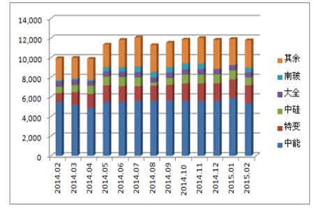 圖2 2014年2月-2015年2月國內(nèi)多晶硅分企業(yè)產(chǎn)量圖 單位:噸