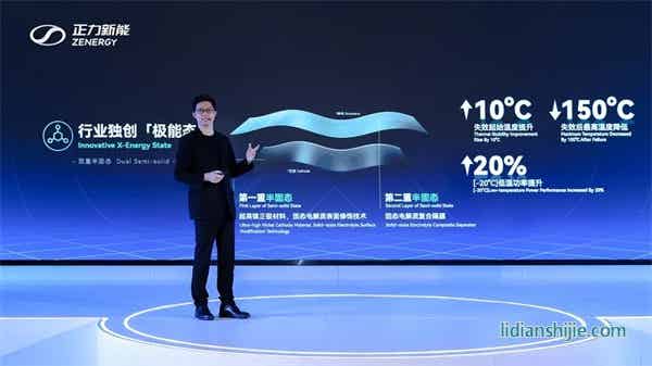 極能態(tài):即雙重半固態(tài)電芯技術(shù)。正力新能研發(fā)了超高鎳正極材料的固態(tài)電解質(zhì)表面修飾技術(shù)和固態(tài)電解質(zhì)復(fù)合隔膜技術(shù)。得益于此,大圓柱電芯的失效起始溫度提升10°C,失效最高溫度降低150°C。功率性能改善上,零下20°C 低溫功率提升了20%。