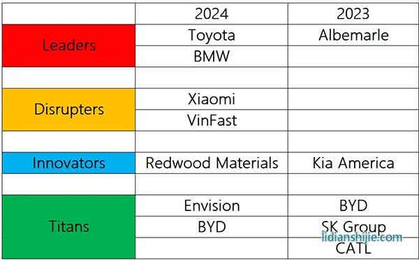 在新能源汽車和鋰電領(lǐng)域,今年全球共有七家企業(yè)入榜,包括豐田、寶馬、比亞迪、小米、越南VinFast五家整車企業(yè),旗下布局鋰電業(yè)務(wù)的遠(yuǎn)景科技集團(tuán),以及一家電池回收企業(yè)Redwood Materials。