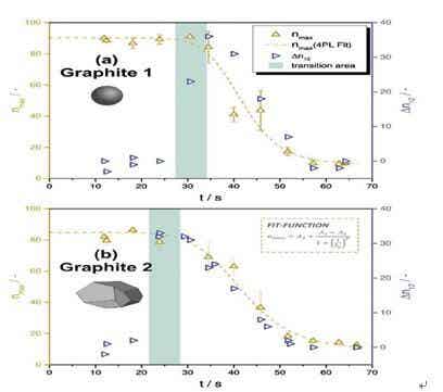 (a)Graphite1(球形,d50=8.9μm),(b)Graphite2(多面體,d50=20.4μm)。從nmax開始減少到平臺結束的時間間隔以以綠色突出顯示,這表明第一個孔洞形成時刻。五角星標記是文獻的轉換時間。